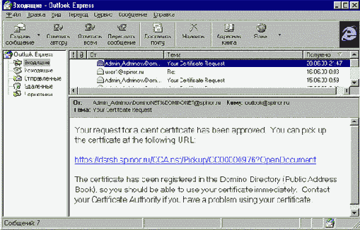 Рис. 114 Пример уведомления о выдаче сертификата полученного по почте, с указанием места нахождения (URL) сертификата.