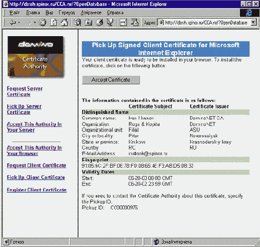 Рис. 115 Просмотр и принятие сертификата от Domino CA.